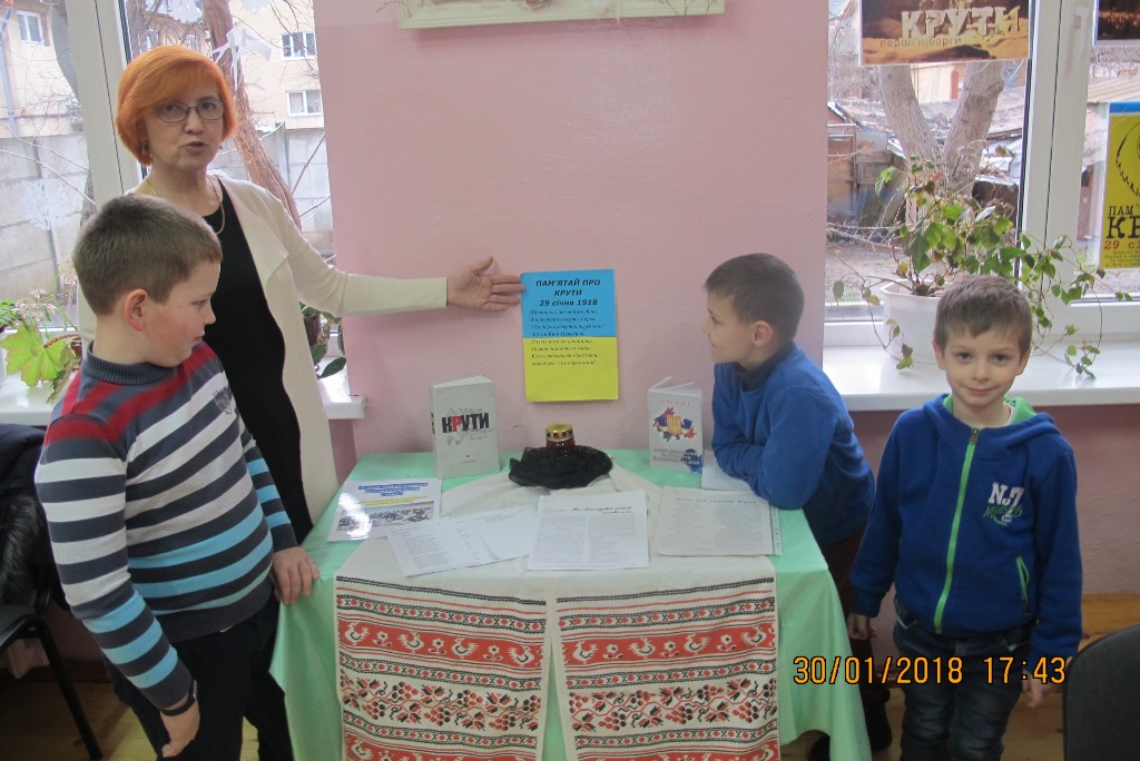 Педагог-організатор-методист клубу «Легінь» Любов Савчук підготувала тематичну книжкову виставку та в бібліографічній довідці «Їх перший бій. Останній бій» розповіла вихованцям про трагічні події сторічної давності.