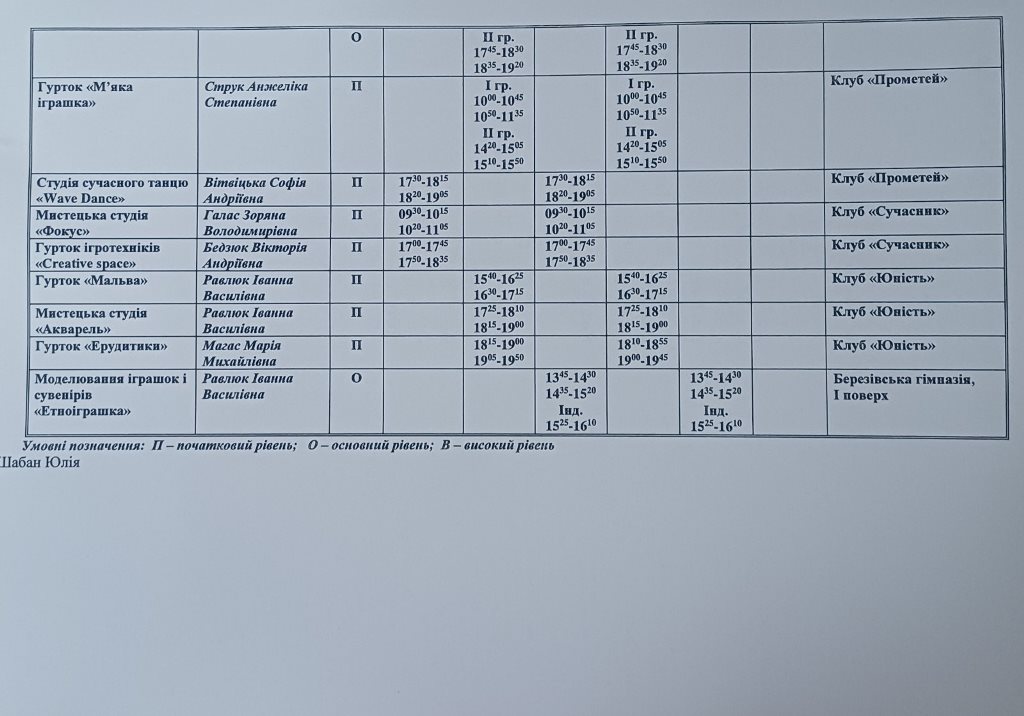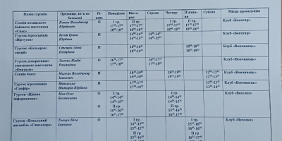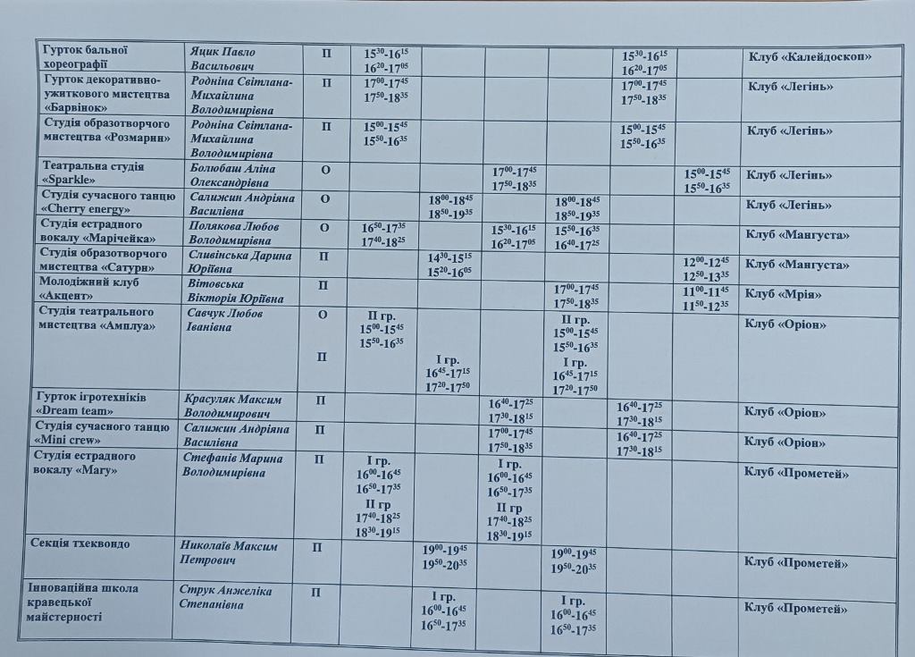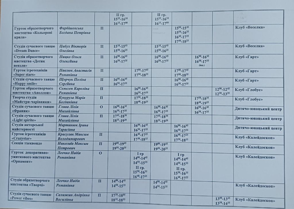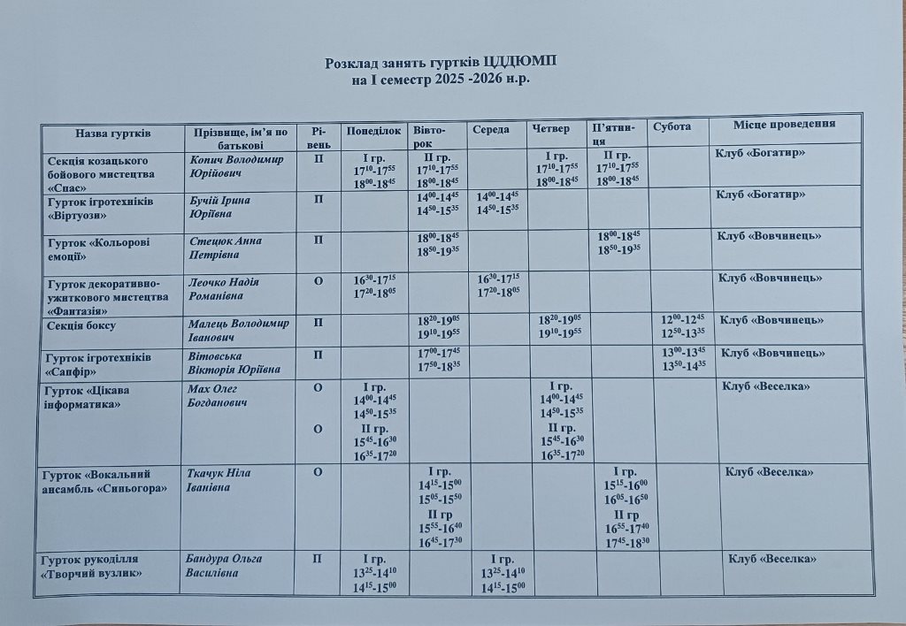 Графік роботи гуртків ЦДДЮМП на 2025-2026 н.р.