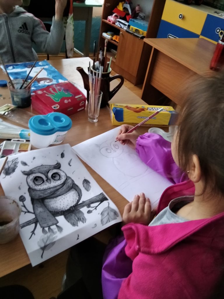 У своїх роботах діти зображали сову по-різному – як чарівну казкову істоту, як охоронницю знань, як символ мудрості або як символ нічної таємниці. Через кольори, лінії та уяву кожна дитина створила власний світ, де сова оживає у фантазіях і мріях.