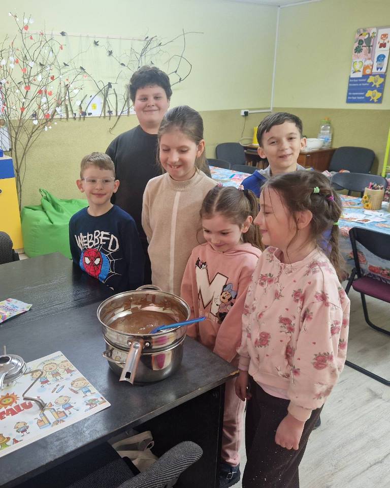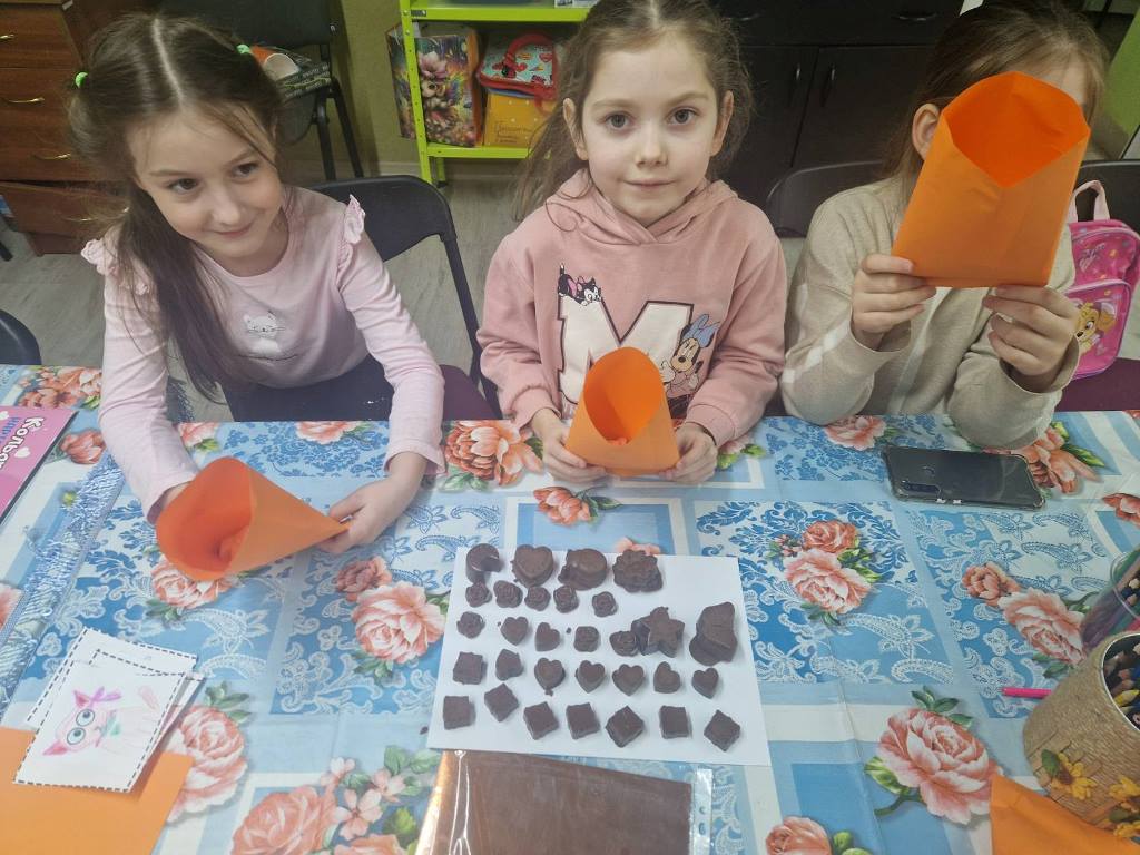 У дитячо-юнацькому клубі «Богатир» діти з цікавістю спостерігали за процесом роботи з шоколадом, знайомилися з етапами його розтоплення та заливання у форми й дізнавалися як створюються солодкі вироби.