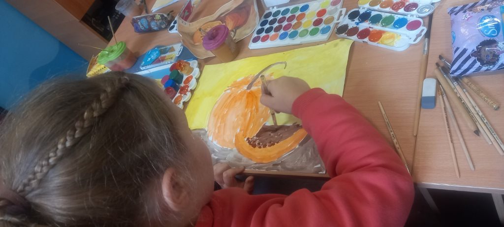 У нас був гарбуз для осіннього малюнка, він яскравий, теплий за кольором і одразу асоціюється з урожаєм, домашнім затишком.