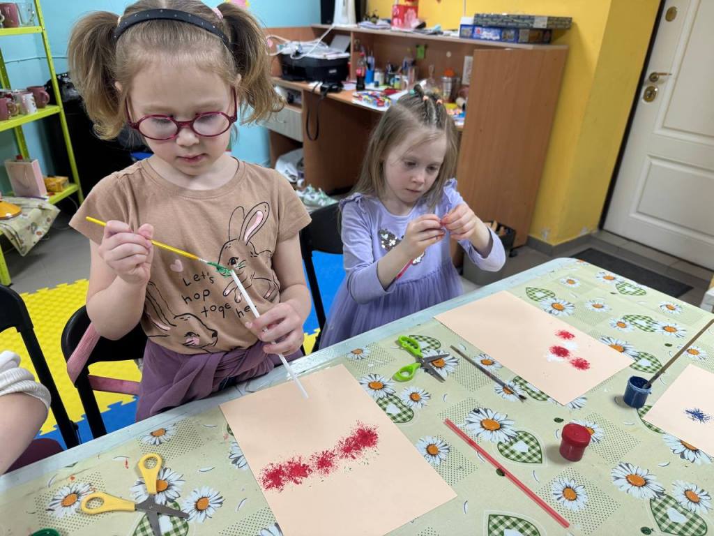 У творчій атмосфері та з яскравими фарбами відбулося цікаве заняття гуртка «Кольорові емоції». Вихованці створювали весняні квіти, використовуючи незвичайну техніку малювання – відбитки та розбризкування фарби.