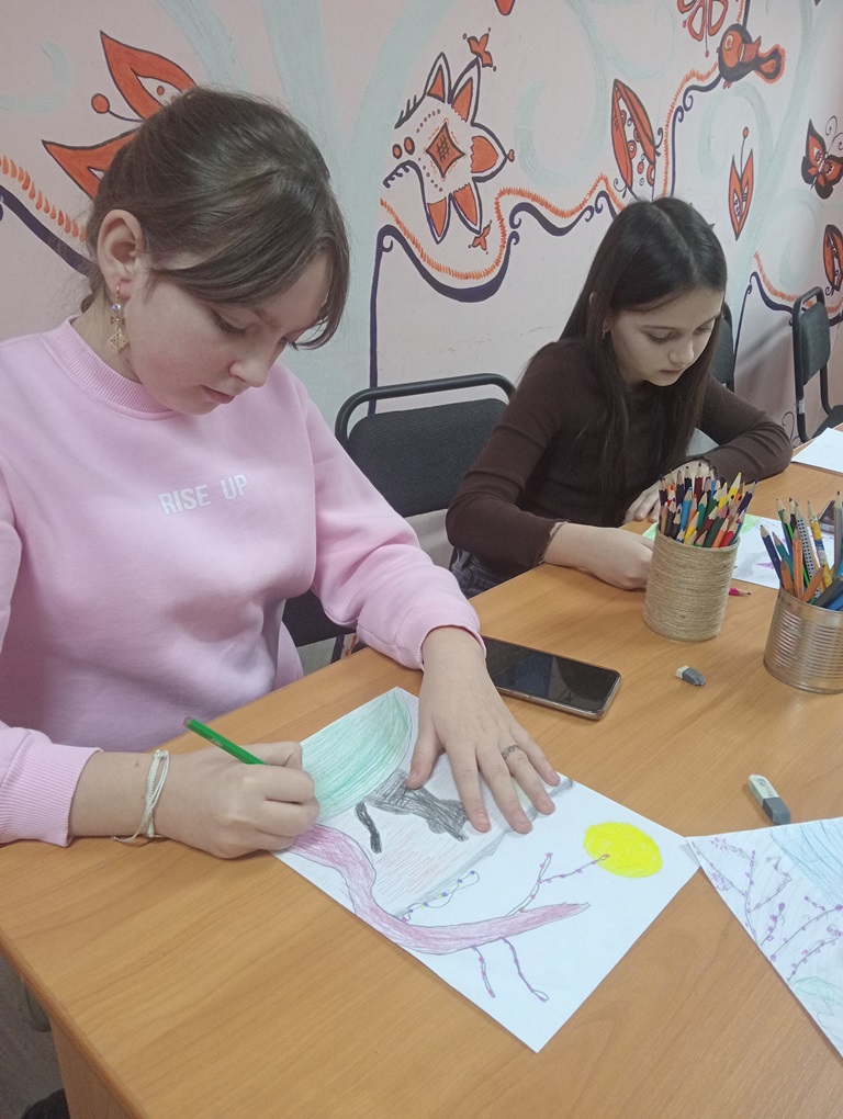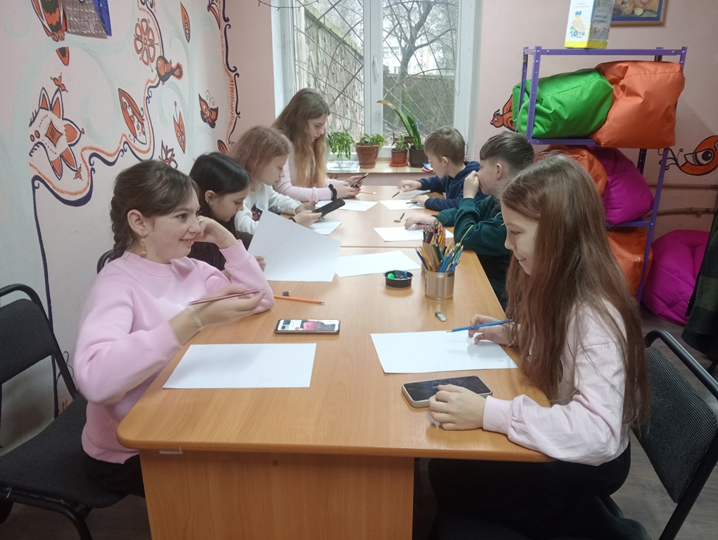 На занятті гуртка «Фокус» (Зоряна Галас) вихованці створювали пейзажі у техніці декоративного живопису, експериментуючи з кольором, ритмом ліній та орнаментальними елементами.