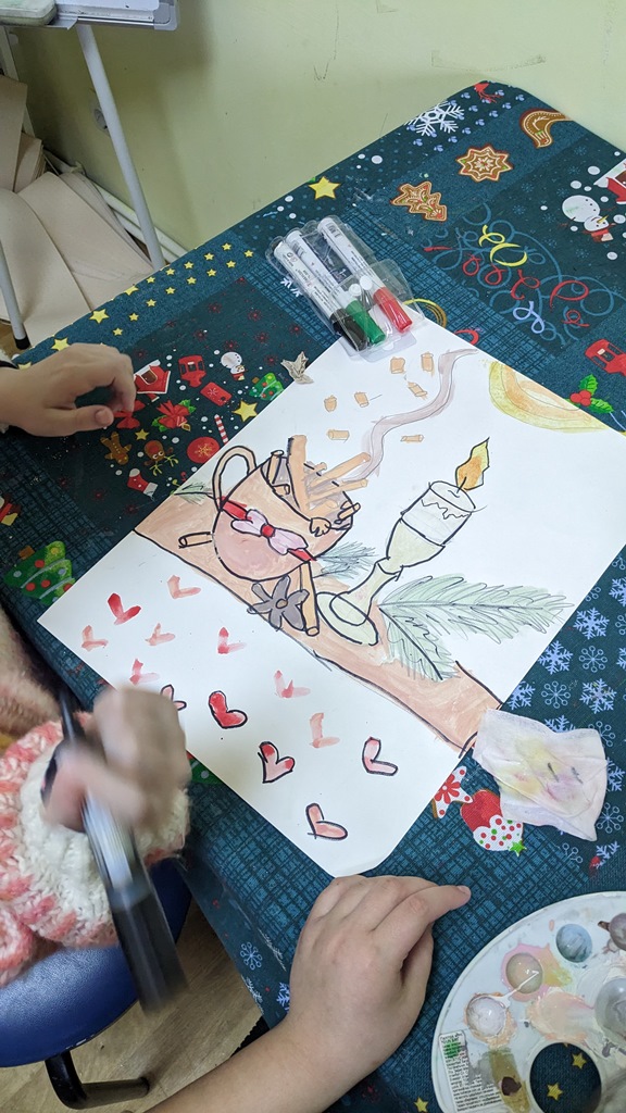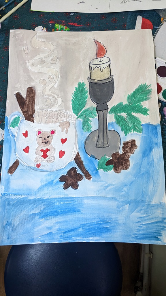 Зима — це не лише холод. Це світло свічок, аромат хвої й теплі відтінки посеред білого спокою. Саме цей настрій ми ловили на занятті «Зимовий натюрморт» у студії образотворчого мистецтва «Творчі».