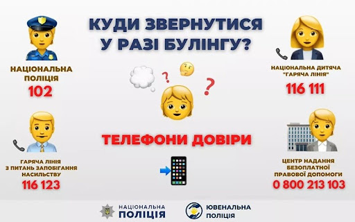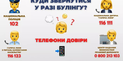 - гаряча телефонна лінія щодо булінгу (цькування) 116 000