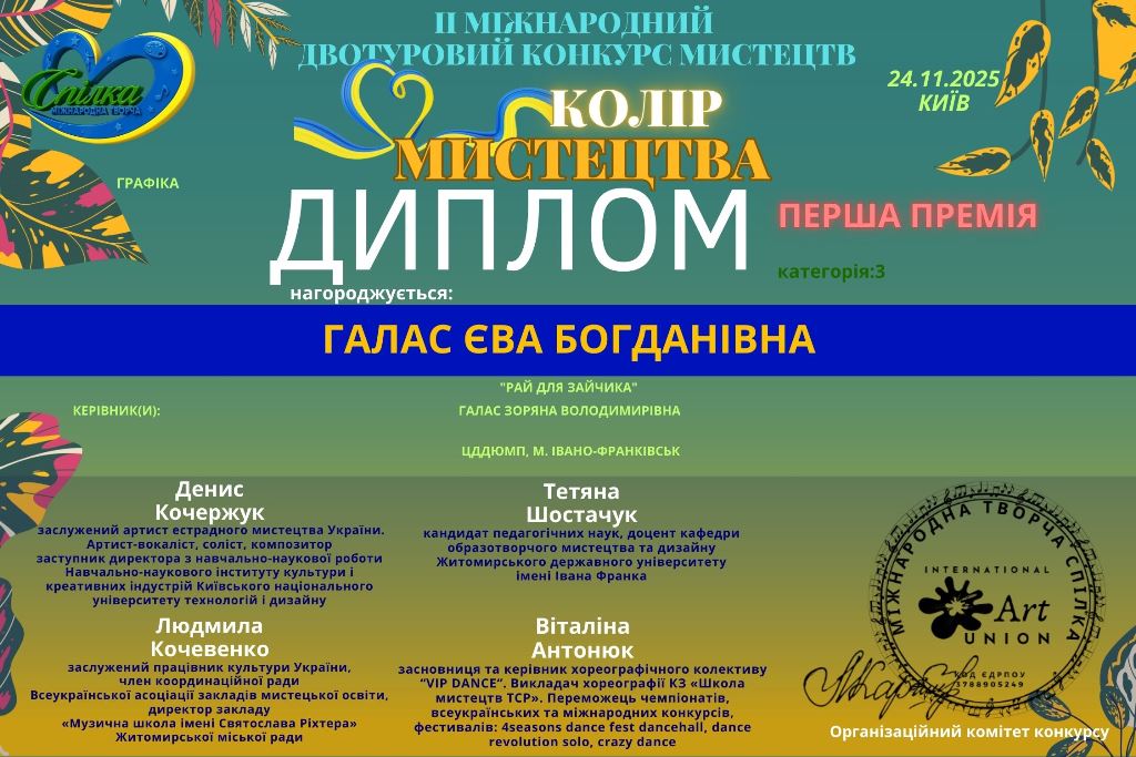 Галас Єва та Голубецька Ольга, вихованки мистецької студії «Фокус» зайняли перше місце на Міжнародному конкурсі мистецтв «Колір мистецтва».