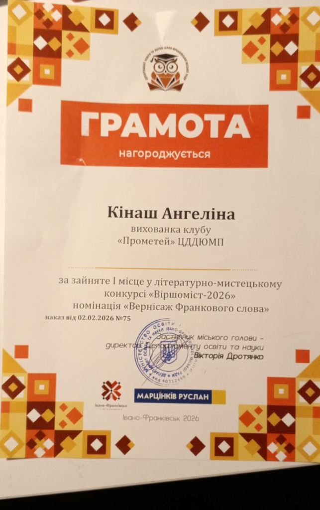 Участь у міському літературно-мистецькому конкурсі «Віршоміст-2026», присвяченому 170-й річниці від дня народження Івана Франка, запам’ятається дітям, адже кожен з них отримав призове місце у своїй номінації.